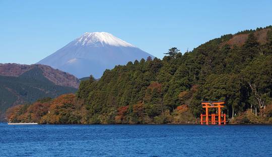 Ville japonaise de montagne située au cœur du parc national de Fuji-Hakone-Izu, Hakone est connue pour ses sources d'eau chaude (onsen) et le panorama qu'elle offre sur l'emblématique volcan du mont Fuji. Elle abrite également le sanctuaire shinto d'Hakone, doté d'une porte "torii" rouge émergeant du lac Ashi, accessible en bateau. C'est également le lieu des sources d'eau soufrée bouillonnante de la vallée d'Ōwakudani.