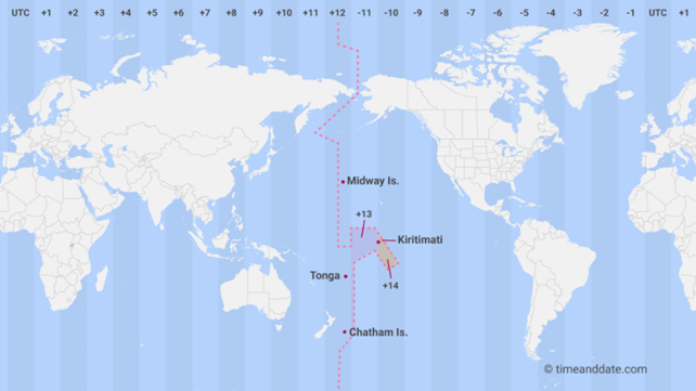 - Avant 1995, la ligne coupait l’archipel des Kiribati en deux, rendant l’administration impossible (quand il était lundi à l’ouest, il était dimanche à l’est). Le gouvernement a décidé de déplacer la ligne de plus de 1000km vers l’est créant le plus grand zigzag actuel pour unifier la date nationale.
